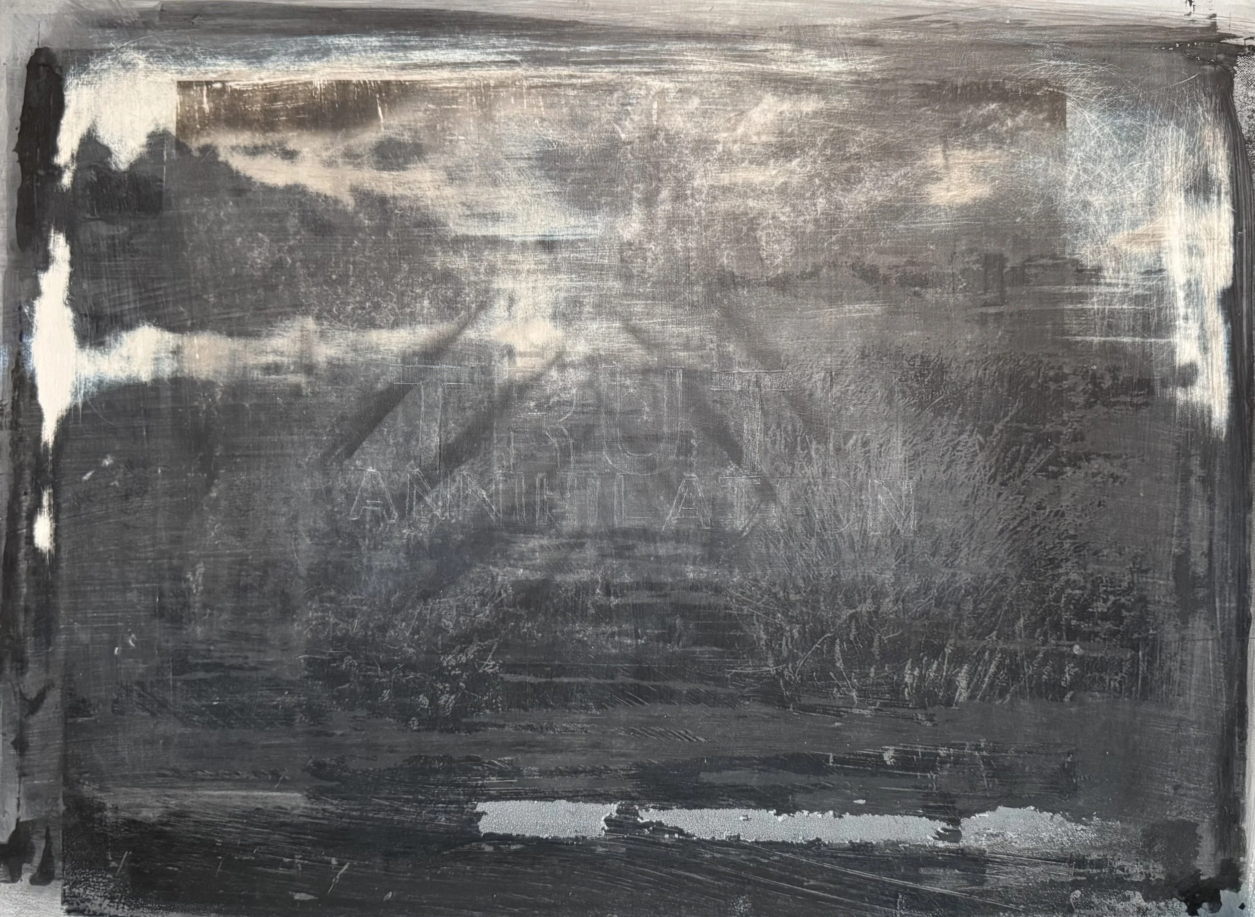 Forces Fleeting was a mixed-media exhibition of new works by artists Nikki Brugnoli and Anne C. Smith, in the first joint installation by the two longtime friends and collaborators. In very different ways, both women explore the transformative power of landscape, with Brugnoli’s gestural screenprint drawings on mylar and wood panels and Smith’s dark pencil drawings on stained linen. Each artist mines and abstracts the shapes they associate with the landscape of home, from Pittsburgh to Northern Virginia (Brugnoli) and Syracuse to Washington, DC (Smith). They hone in on specific elements of those landscapes – a water tower, a horizon line – forms that enable their studio practice to become meditations on stillness, memory, life’s rhythms and transitions, and loss. The works are primarily dark, and largely monochromatic with sweeping areas of carbon-black ink, while key moments of color shimmer and emerge inside the shadowy forms held in remembered or imagined spaces.